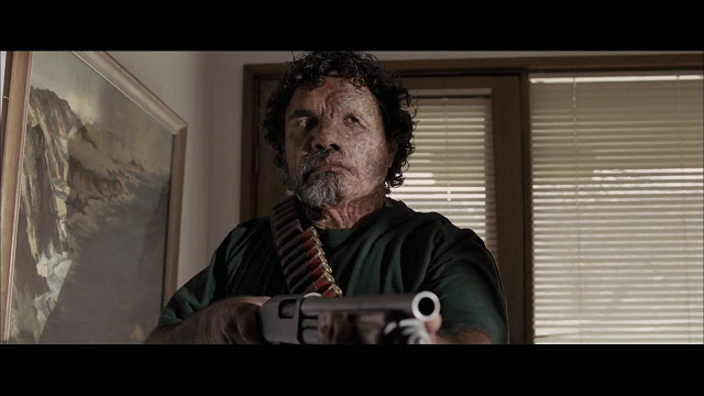 Vaikka mies ei sano juuri sanaakaan leffan aikana, vakuuttaa hän eleillään ja tuo mieleeni Charles Bronsonin parhaina päivinään. Hahmosta olisi vaikka nykypäivän kauhuikoniksi.